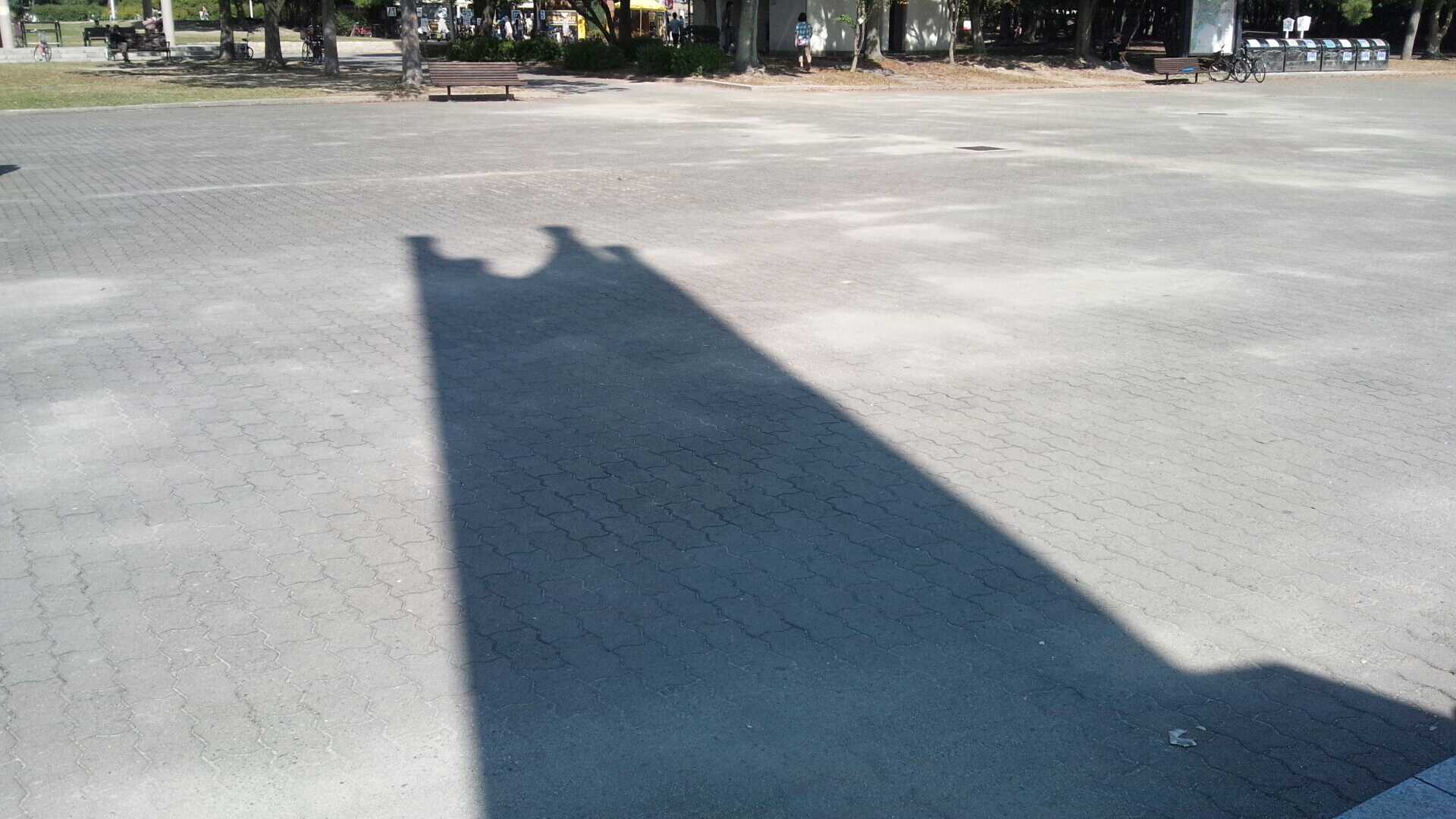 今日は服部緑地でのパフォーマンスでした。 日陰は涼しいのですが、日向はやっぱり暑いです。 お客様には日陰で のんびりと観ていただけるといいのですが、 いかんせん演技場所にある影は、 ←これだけでして・・・ 暑い中ご覧いただきありがとうございました!