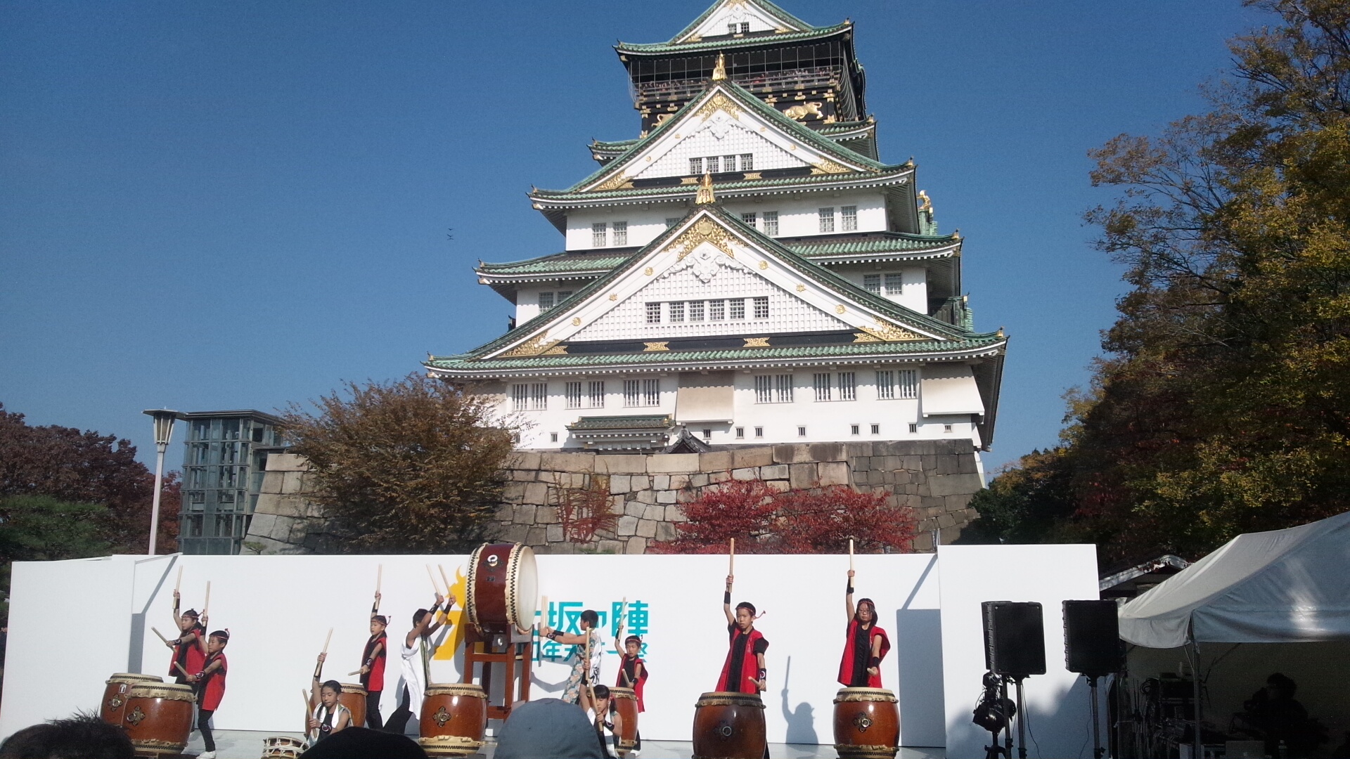 24日は、大阪城天守閣前広場でのパフォーマンス。 先月は台風接近のため中止となったので、2か月ぶりです。 今、大阪城周辺では、「大阪の陣400年天下一祭」が 開催されており、天守閣前でも和太鼓の演奏などが 行われていました。 天候に恵まれた3連休ともあり、 たくさんの来場者で、大阪城の入り口には、 随分の間行列ができていました。