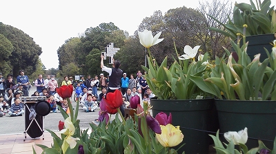 今日は、服部緑地でのパフォーマンスでした。 パフォーマンス場所にあるシンボルタワーの周りには 花壇があり、チューリップやパンジーが、 シンボルタワーをカラフルに彩られていてとても綺麗です。 それにしても今日は 20度前後の気温で、空がう〜っすらと雲で覆われるという まさに絶好の行楽日和でしたね。