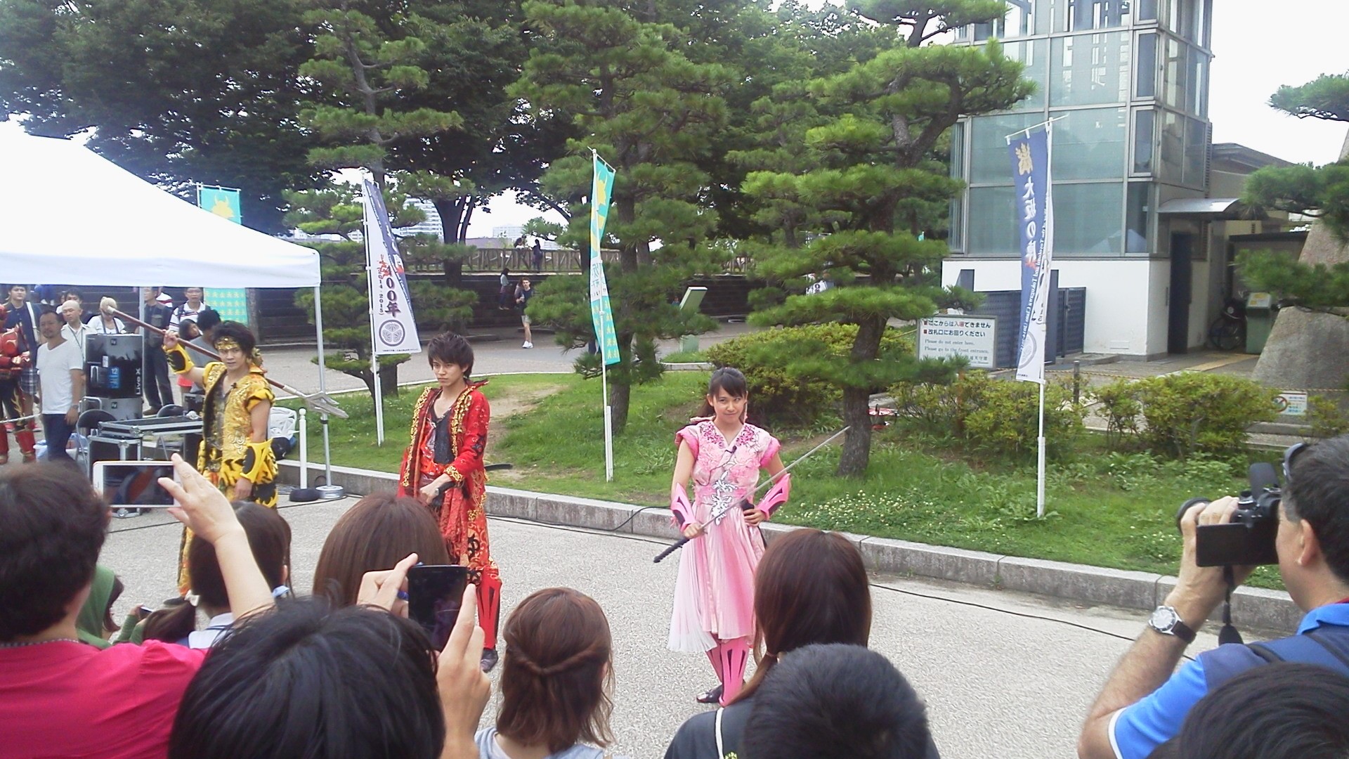今日は大阪城天守閣前でのパフォーマンス。 7月から?大阪城は夏の陣というのが始まり、 今日はRONIN5が登場していました。 いつもは5人ですが今日は3人でした。 遭遇したのは昨年の秋ぶり。 最後に撮影会があり、 確か一緒に取ると 「ろーにんふぁいぶ!!」 と叫んでポーズを撮ってくれます。 この夏大阪城はイベントが目白押しのようです。