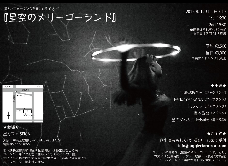 さて、12月5日(日)の 「星空のメリーゴーランド」 お陰様で19時半の回がお座席残り本当に僅かです。 普段のショーでは見られない、 スペシャルなシガーボックスパフォーマンスを 絶賛準備中ですのでお見逃しなく! あっ、12月7日(月)には静岡公演もあります! 詳しくは・・・ ・大阪公演のページ ・静岡公演のページ をごらんください!